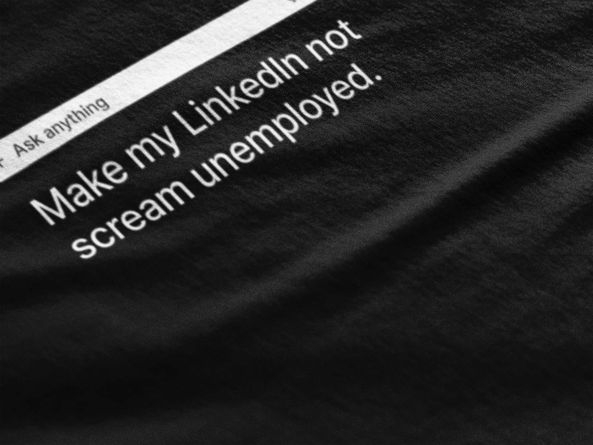 This lightweight, ultra-soft tee now comes in a bold dark edition — featuring the same quiet, clever message for anyone tired of curating a perfect online persona. Designed in a clean “Ask Anything” AI search-bar style, the white graphic pops sharply against the dark fabric for a crisp, modern look. Subtle enough for everyday wear, sharp enough to get a knowing smirk from coworkers, recruiters, and friends.
